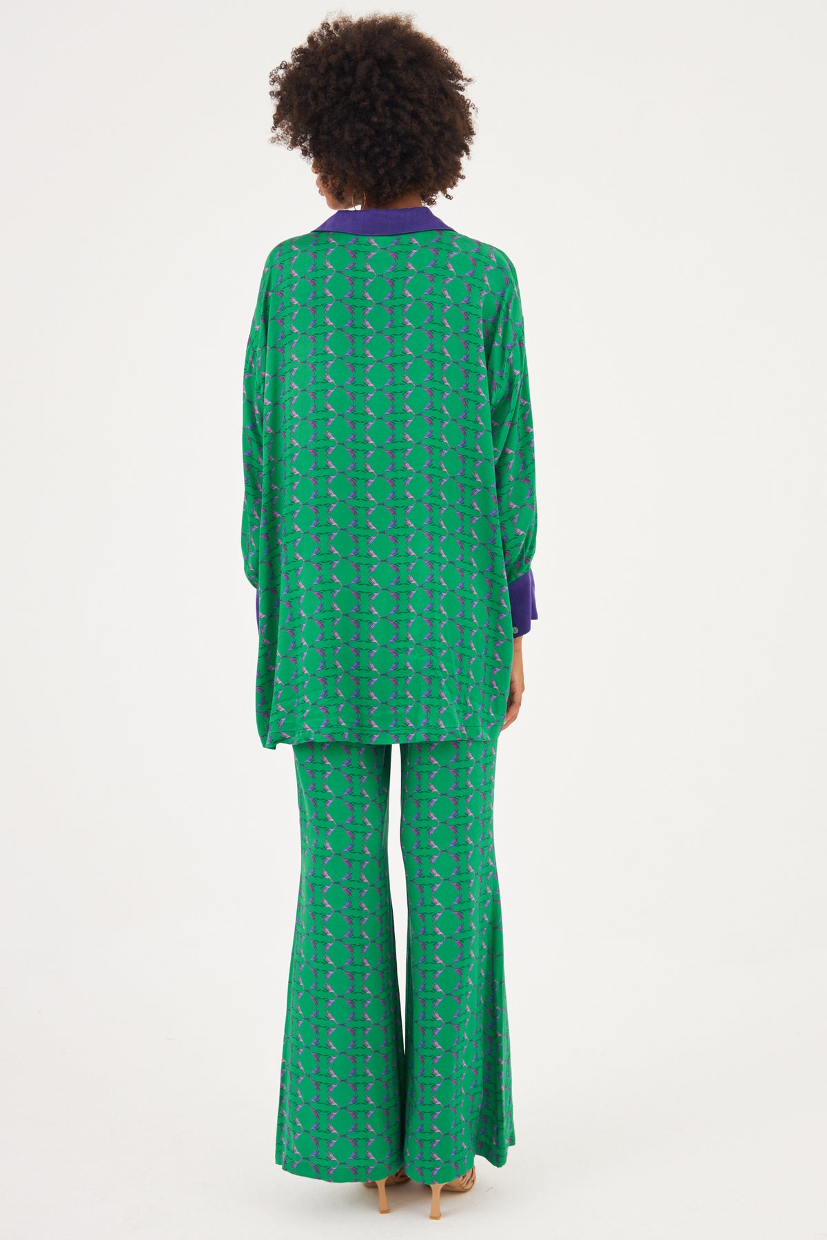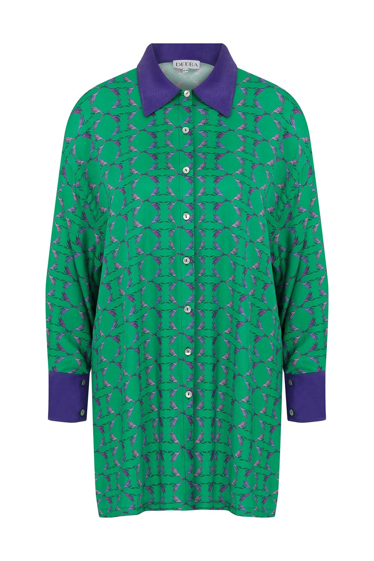 The Shiloh shirt is a loose fitting one size shirt that can fit from size 6-12 UK. The block collar and our signature cuffs add a pop of colour. Wear Shiloh out paired with our new flared trousers or with jeans for a laid back look.