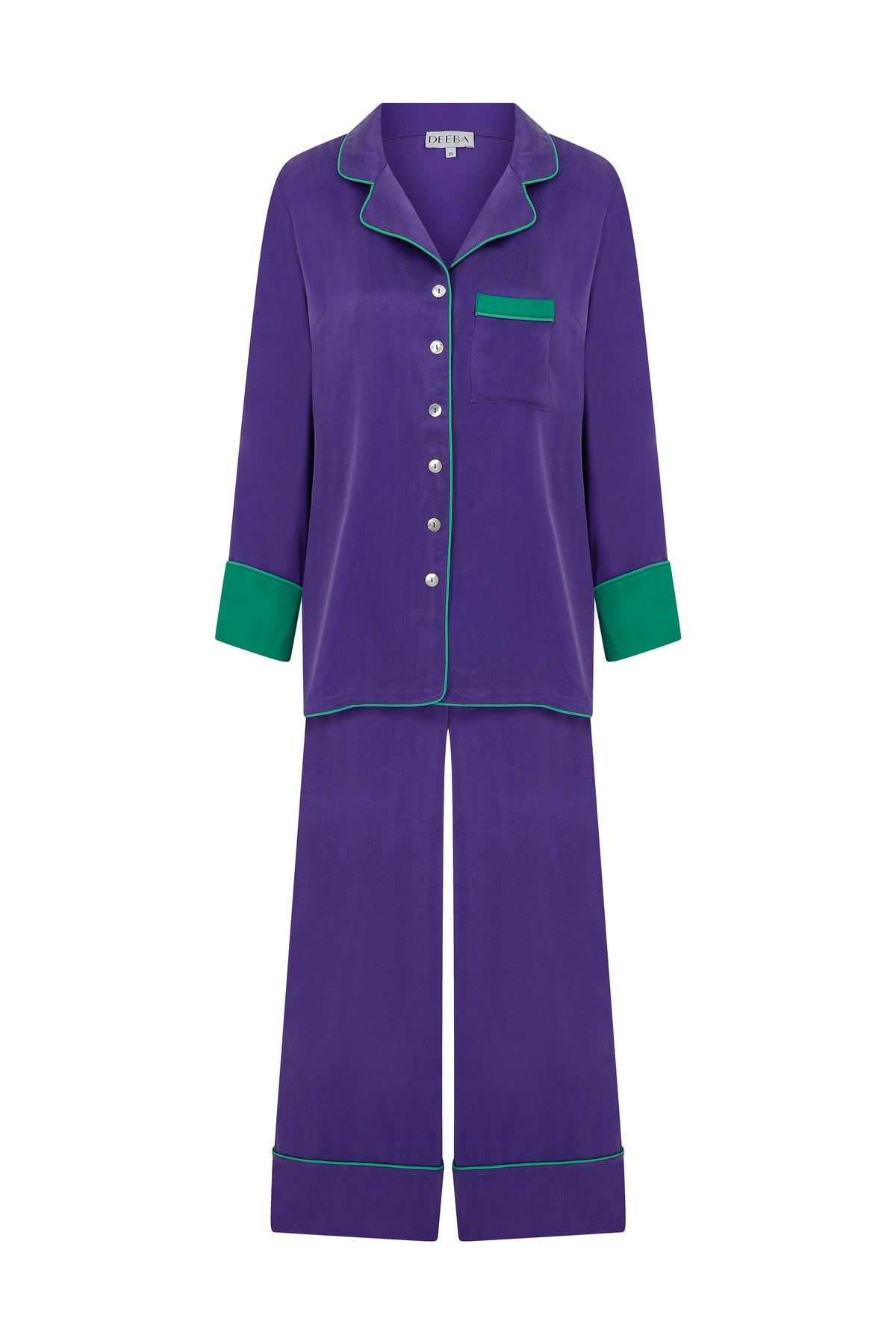 Our classic PJ set has block colour cuffs, contrasting piping, and shell buttons add to its chic and luxurious look. Paired with the high waisted wide leg PJ trousers - the perfect mix between comfort and style.